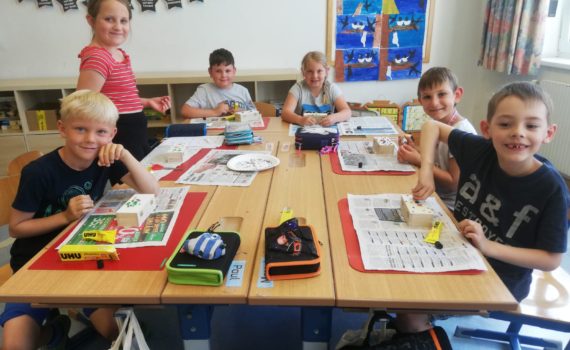 Die 1. Klasse verziert Schatzkisten für die Schatzwörter