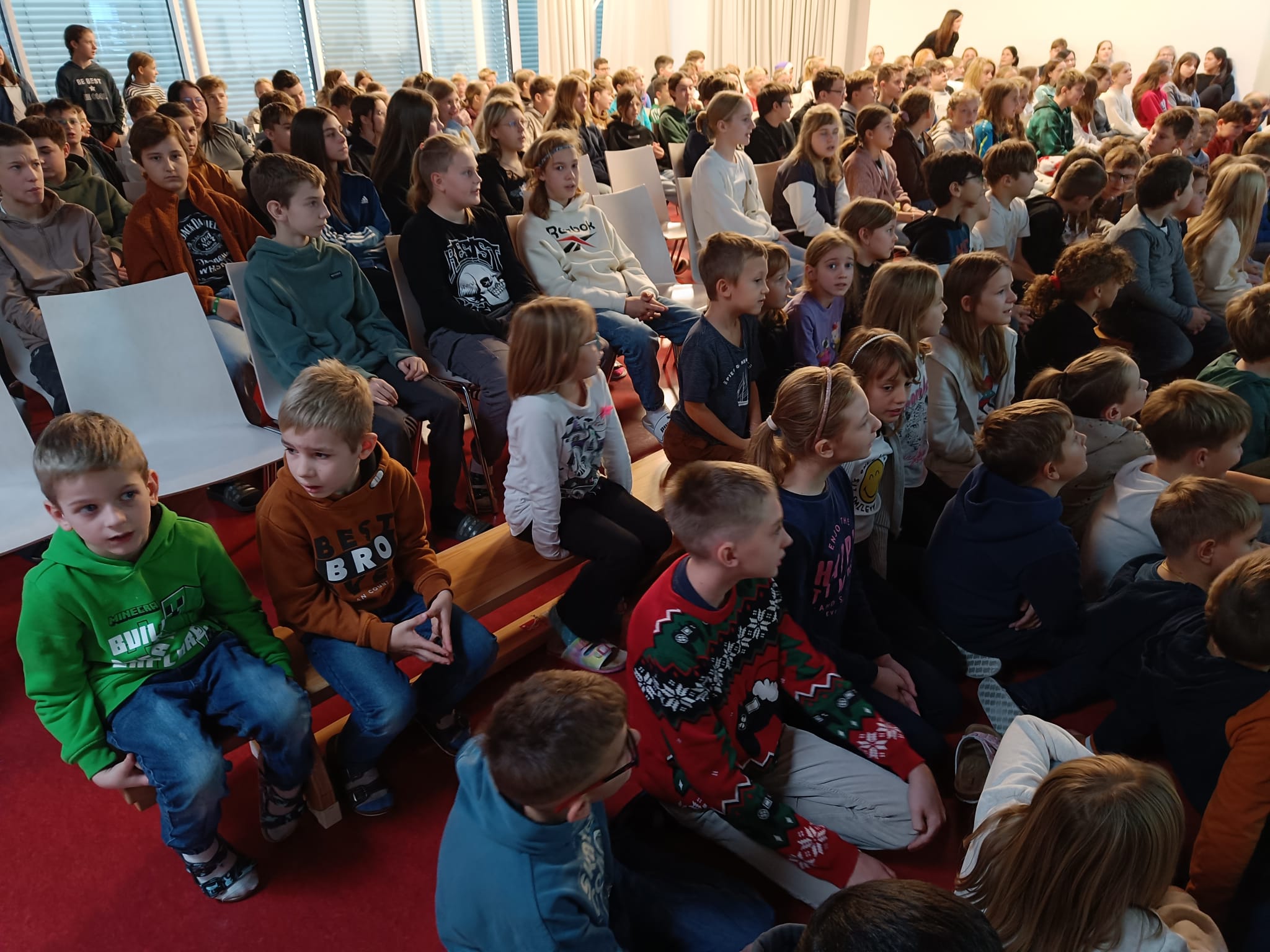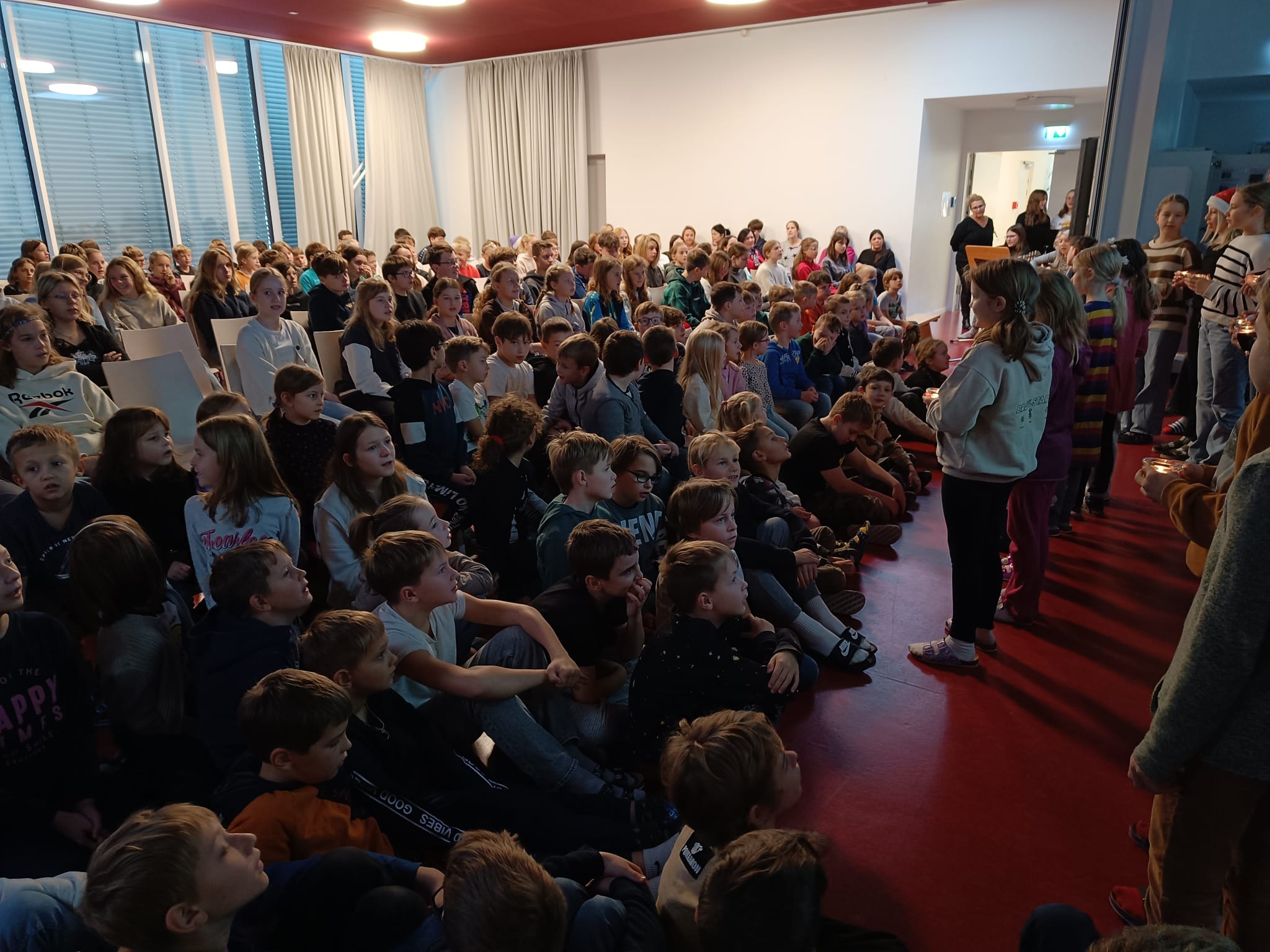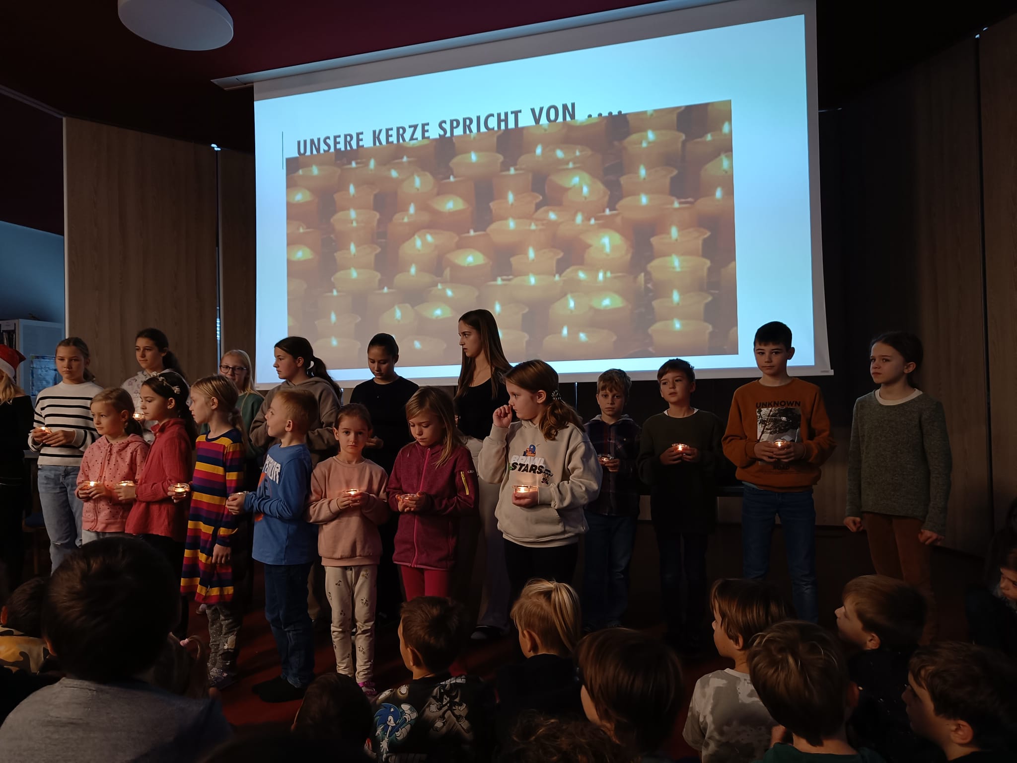 Zur Einstimmung auf das Weihnachtsfest wurde im Festsaal der Schule eine Adventkranzweihe veranstaltet. Die Kinder gestalteten die Feier mit Gesang und kleinen Beiträgen und Pfarrer Ulrich Dambeck segnete die zahlreichen mitgebrachten Adventkränze. Gemeinsam Kerzen entzünden, beten und singen – ein schönes Ritual im Advent!