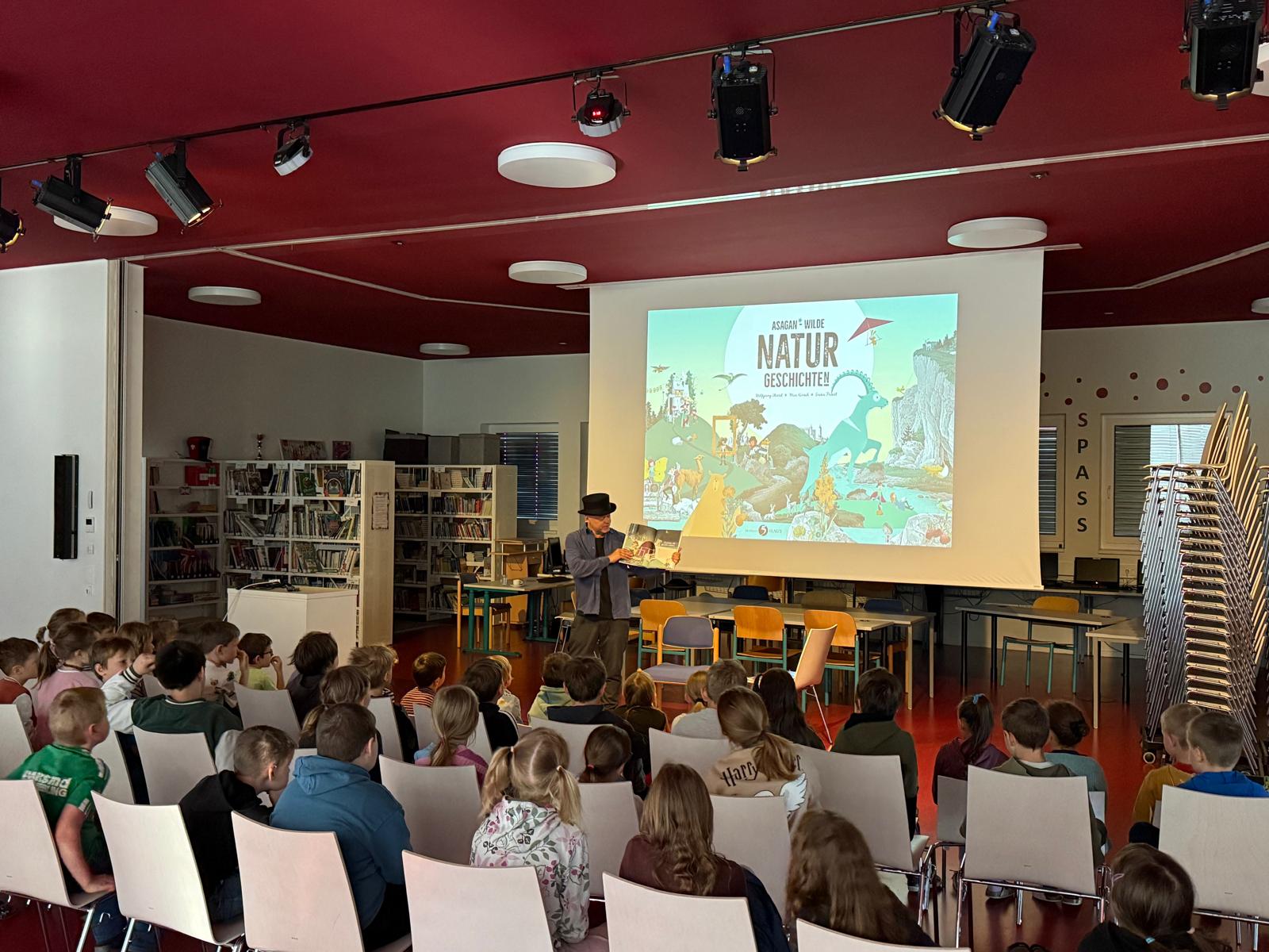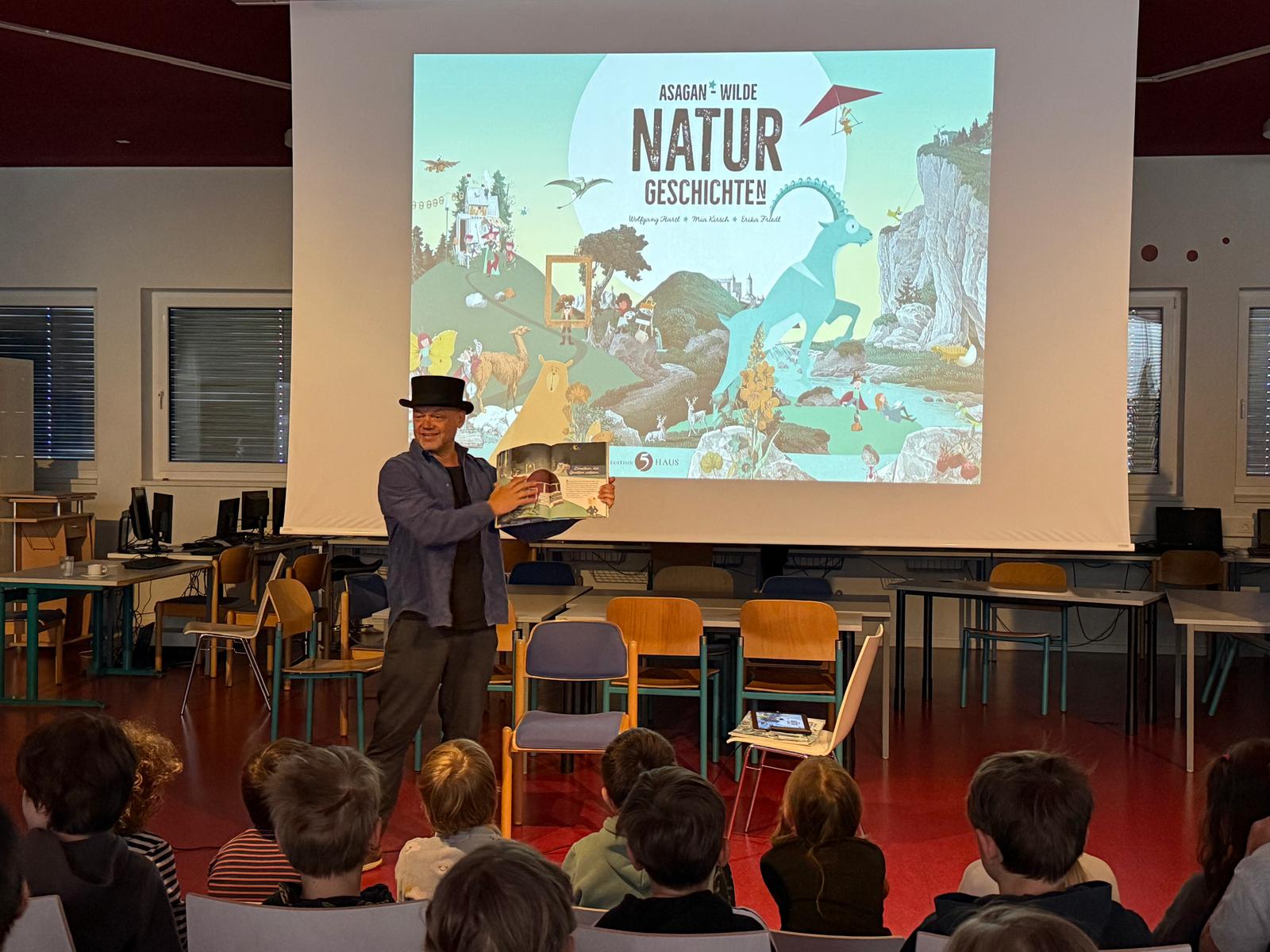 Im Festsaal der Schule fand eine Autorenlesung mit Wolfgang Hartl statt. Hartl las aus seiner mehrfach ausgezeichneten Buchreihe „Asagan“ vor. In seinen Geschichte geht es um echte Höhlenschätze und Donaupiraten, die die Natur einmal ganz anders – als Kunst – erleben. Die Natur wird Schauplatz für neue Abenteuer rund um Dinosaurier, Drachen, Pflanzen und andere Tiere. Die Kids erlebten eine Zeitreise mit echten Wissensschätzen und hatten dabei einen echt spannenden und kurzweiligen Vormittag!