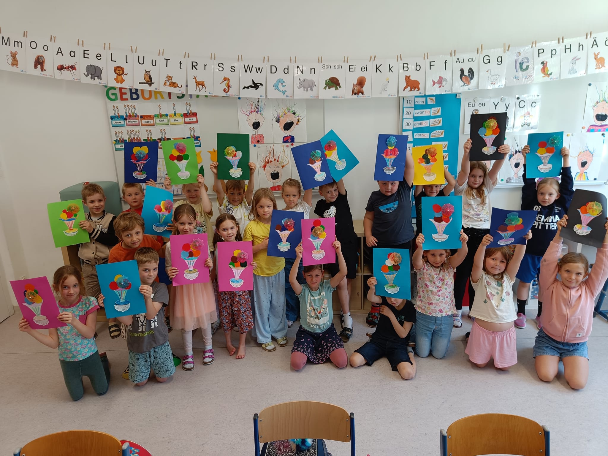 In der 1a ist die Freude über die nun langsam steigenden Temperaturen groß – endlich ist der Sommer da! Und mit ihm können wir auch alle angenehmen „Begleiterscheinungen“ genießen: Eis essen, im Freien spielen und Sport betreiben, Sommerkleider und kurze Hosen anziehen und Vieles mehr. Auch in den wunderbar fröhlich-bunten Zeichnungen der Kinder drückt sich diese Freude aus!