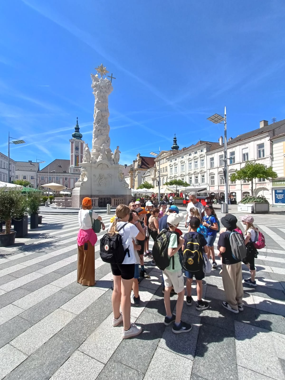 Ein Besuch der Landeshauptstadt stand für die vierte Klasse auf dem Programm. Gemeinsam mit ihrer Klassenlehrerin Daniela Trimmel machten sich die Kinder mit dem Bus auf den Weg nach St. Pölten. Bei der Führung durch die Altstadt besichtigte die Gruppe das Rathaus, die Pestsäule, das Tellerhaus und den Dom. Nächster Programmpunkt war das Mittagessen in der HTL und danach ging es zum Regierungsviertel. Hier gab es den Landtag und den Klangturm zu besichtigen. Ein sehr interessanter und lehrreicher Ausflug für die Viertklässler – sie haben den Tag sehr genossen!