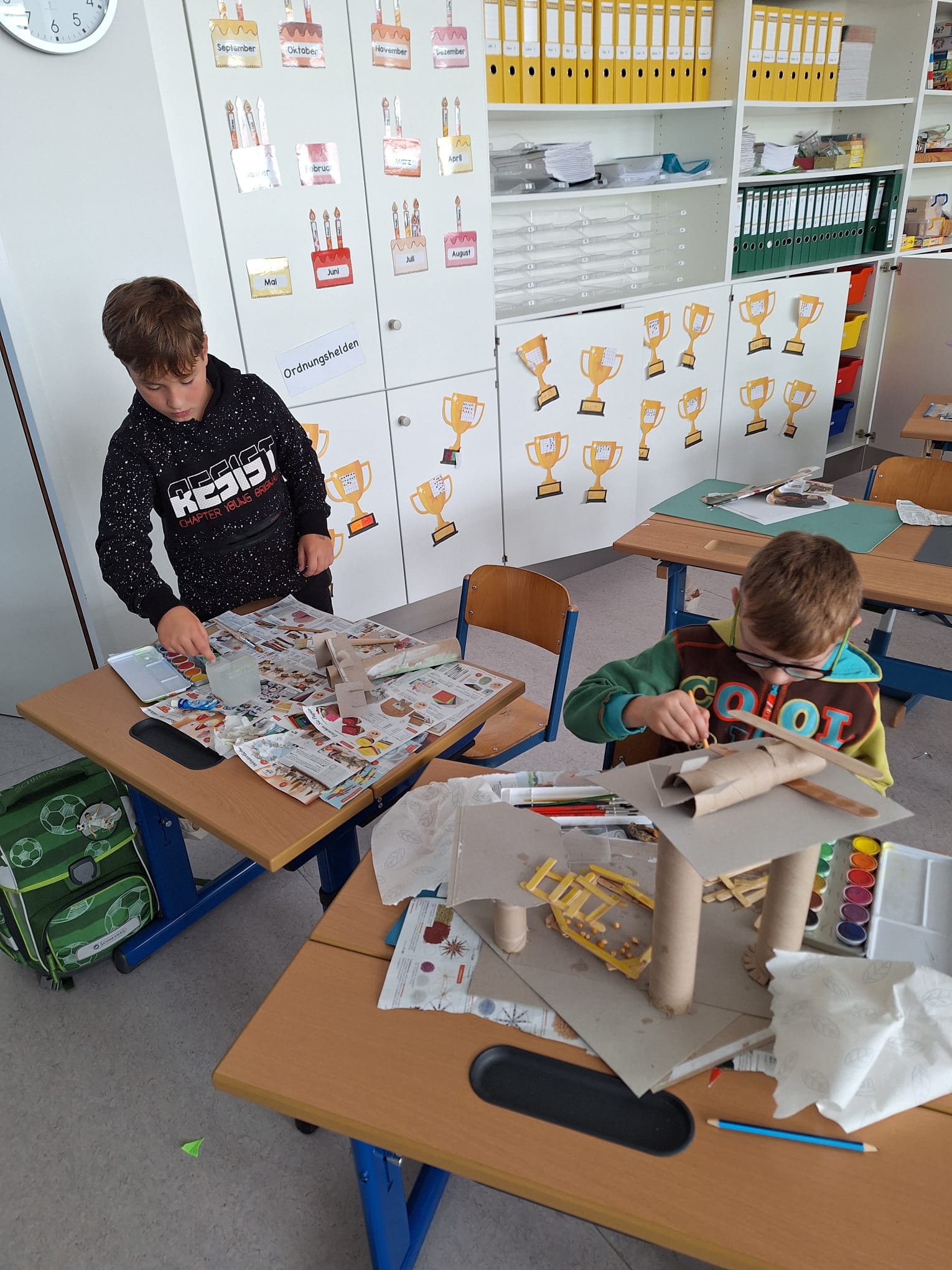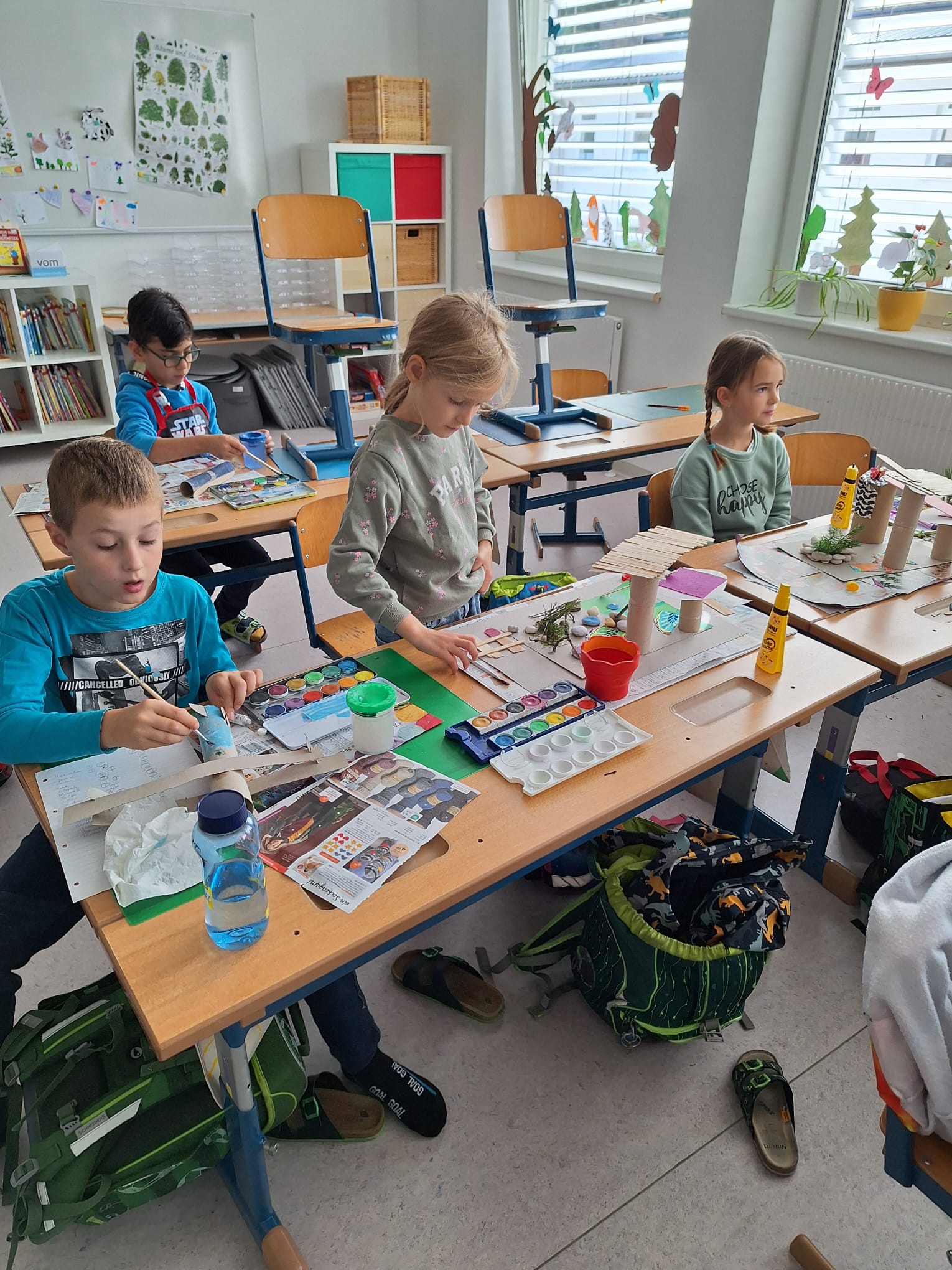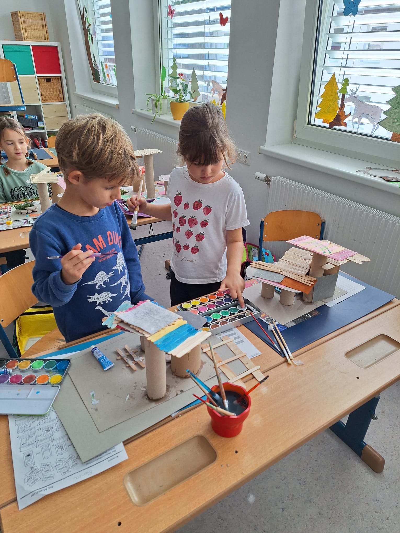 In der zweiten Klasse waren die Kinder sehr kreativ und gestalteten aus Natur- und gebrauchten Verpackungsmaterialien neue Objekte. Dieses Mal waren es Baumhäuser und Flugzeuge, die von den Buben und Mädchen mit viel Geschick und Fantasie gebastelt wurden. In einer eigenen Ausstellung konnten die Mitschüler aus den anderen Klassen die fertigen Kunstwerke bewundern!