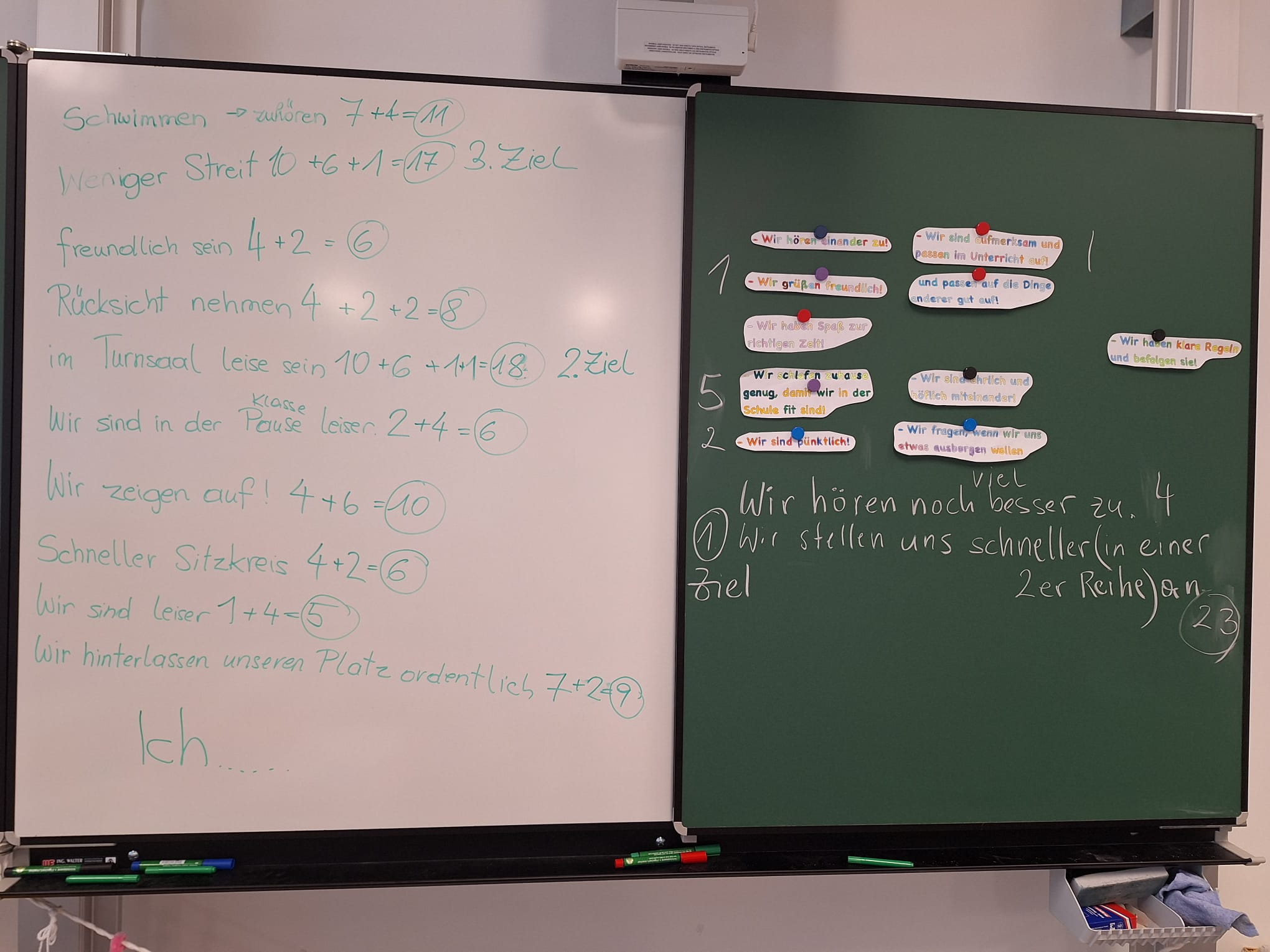 Das von der Österreichischen Gesundheitskasse für Schulen entwickelte Programm WOWW (Working On What Works) soll die Qualität des Klassenalltags verbessern und brauchbare Handlungsstrategien bei Problemen finden – aufbauend auf gegenseitigen Respekt und die Zusammenarbeit zwischen Lehrkräften und Schülerinnen und Schülern. Die Leiterin des Workshops, Sophia Bolzano, erarbeitete gemeinsam mit den Kindern ausgehend von verschiedenen Klassenregeln klar formulierte Ziele, die schriftlich festgehalten wurden. Natürlich sollen diese Ziele dann auch so gut wie möglich erreicht werden. Die Kinder beteiligten sich aktiv am Workshop und arbeiteten brav mit.